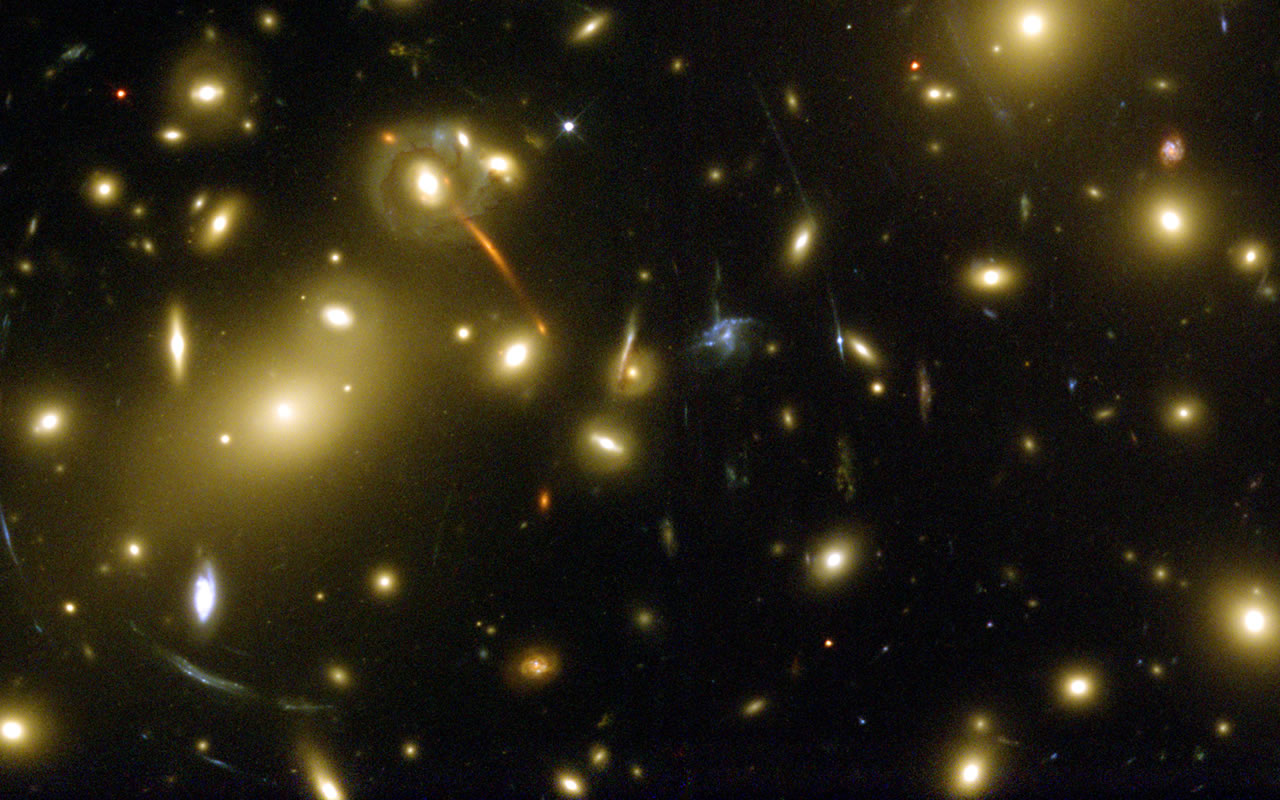 It depicts a big cluster of galaxies about a billion light years away. The image also shows numerous faint streaks and arcs: each is a remote galaxy, several times farther away than the cluster itself, whose image is, as it were, viewed through a distorting lens. Just as a pattern on background wallpaper looks distorted when viewed through a curved sheet of glass, the gravity of the cluster of galaxies deflects the light rays passing through it. The visible galaxies and gas in the cluster contribute far less light-bending than is needed to produce these distorted images — evidence that clusters, as well as in individual galaxies, contain much more mass than we see.